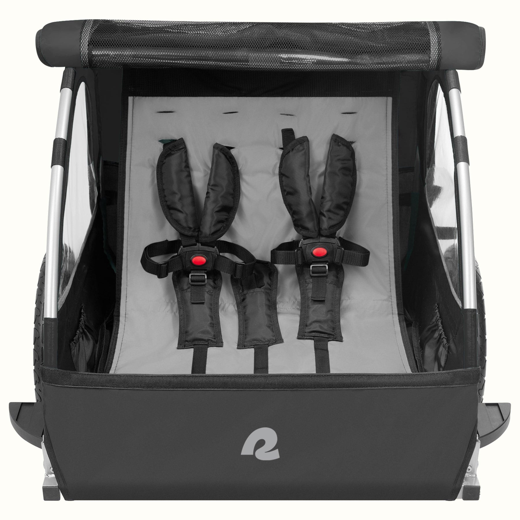 Take family bike rides to the next level with Rover. This premium bike trailer for kids can carry 2 passengers and lets little ones tag along safely and comfortably whenever you want to head out for a ride. Compatible with most adult bikes and ebikes, this bicycle trailer’s folding frame is made of lightweight aluminum, making it easy to tow, store, and carry. Safety features like a 5-point harness with an easy-to-use buckle, high-visibility fabric, reflectors, and a flag keep kids safe inside the trailer and out. An extra-roomy interior with pockets for snacks and toys, padded straps, and smooth-rolling spoked wheels keep them comfortable on every ride. Plus, with enough storage space to bring along everything you need, Rover Plus turns every ride into a new adventure together.
